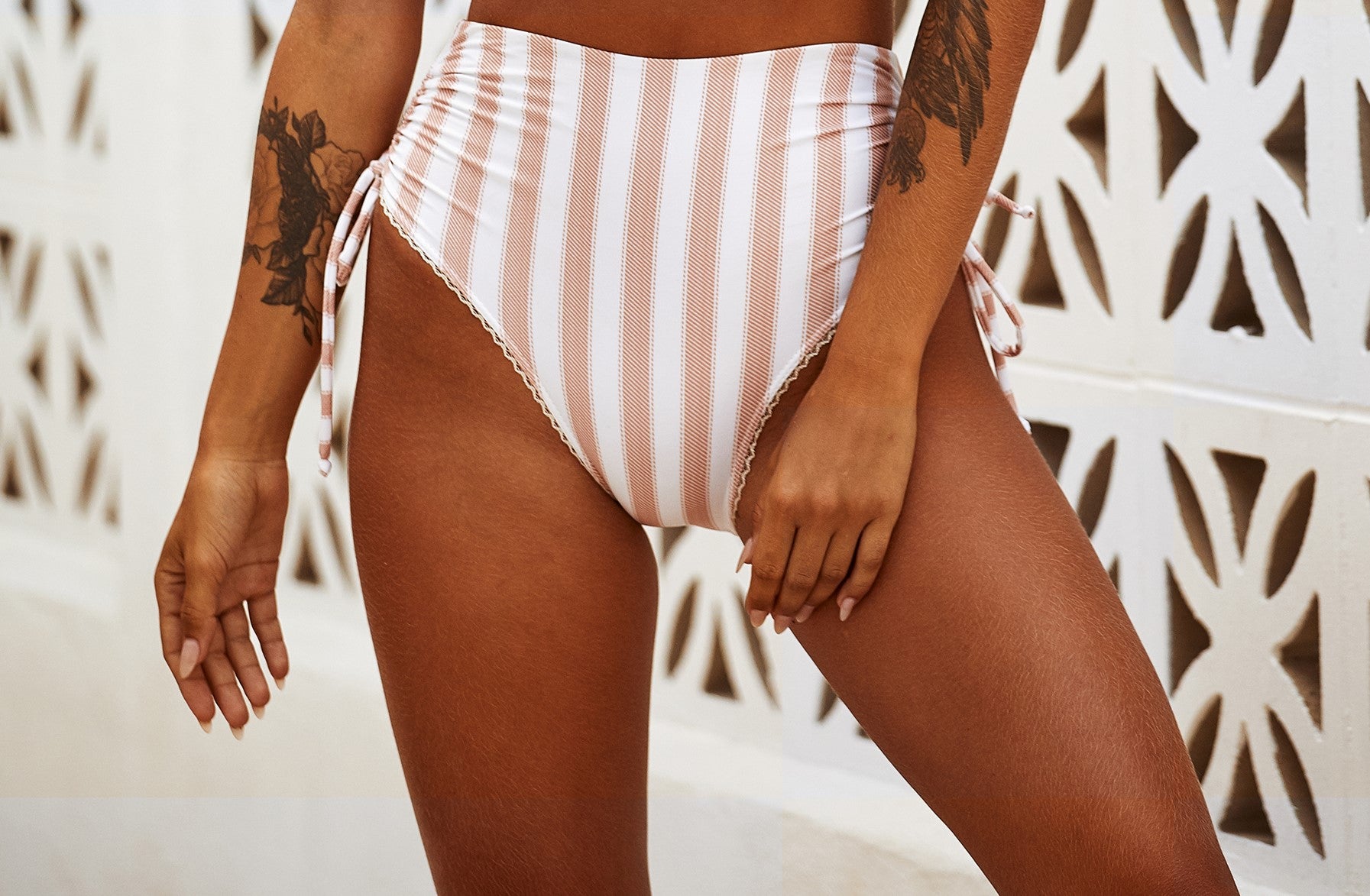 The Key Largo swim pant is high waisted with rouched tie sides, adjustable to be worn low or high, and fine lace detail, for a complete vintage inspired look.