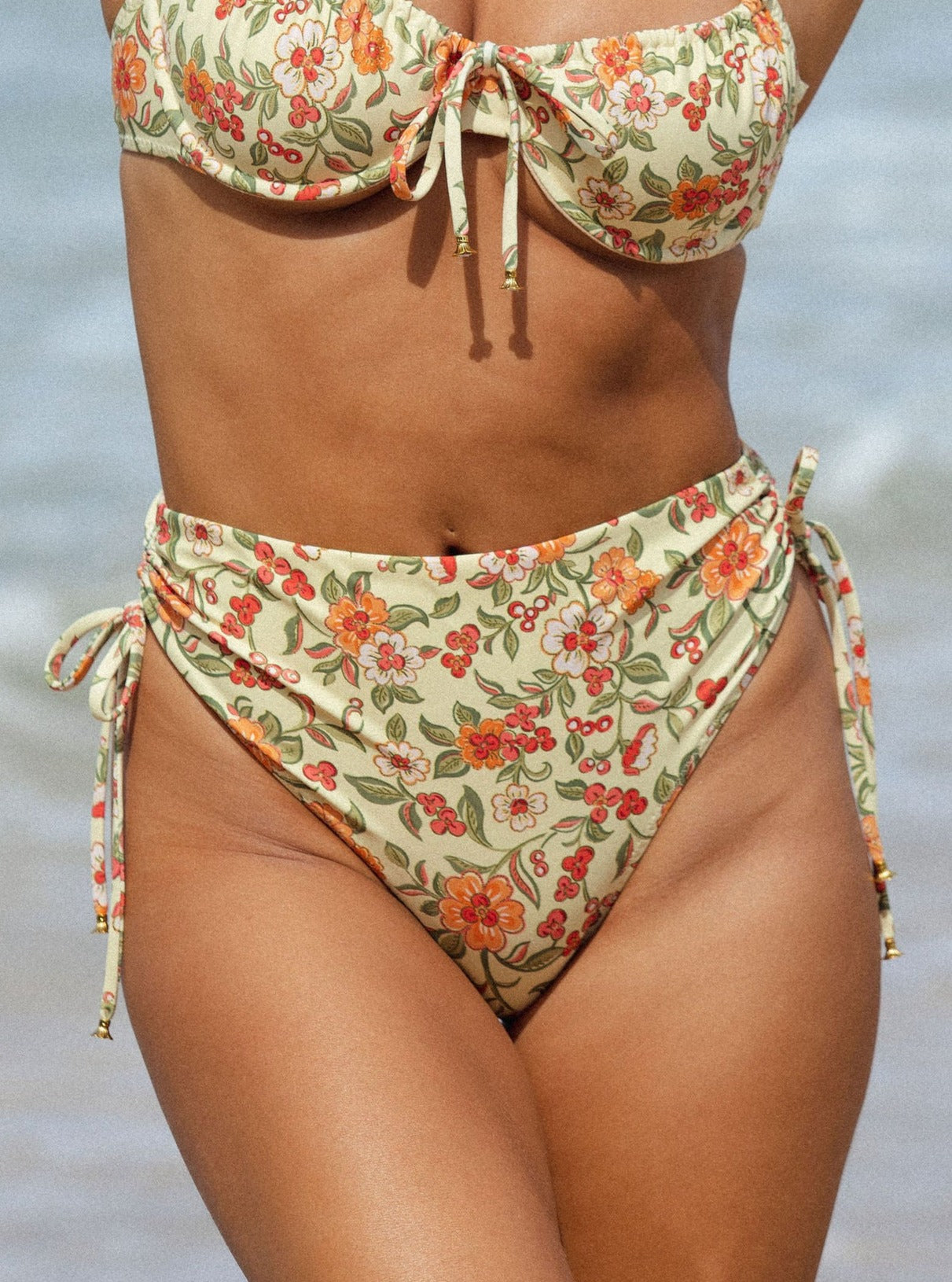 The Poppy high-waisted ruched pant has tie sides finished with a gold bead detail that can be worn high cut or lower. This flattering pant is firm fit to hug your body and has great bottom coverage. Pair with the Clover Triangle Bralette or the Daliah Underwire Bralette for the perfect summer's day. Handmade with love on the Gold Coast, Australia.